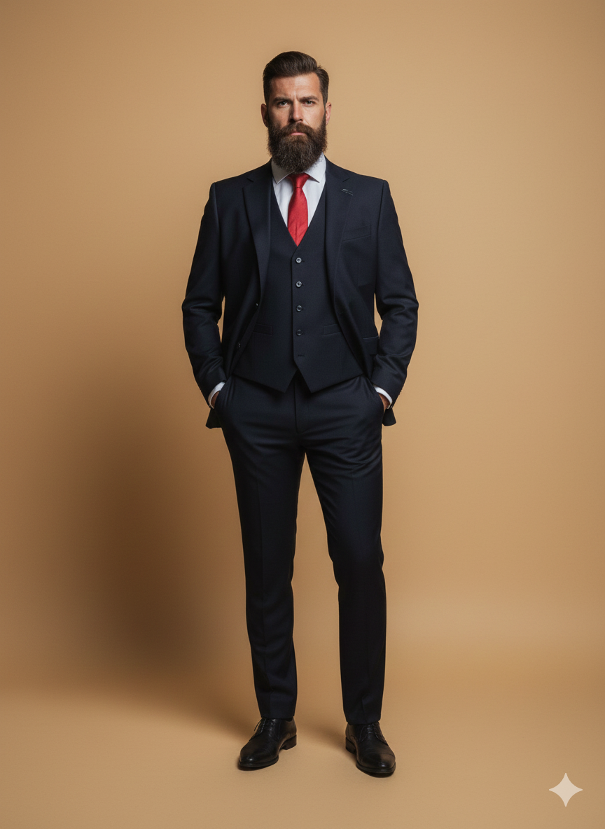 Wil jij strak en verzorgd aankomen op je zakelijke afspraak? Dan is dit navy pak, of een van onze andere driedelige pakken, precies wat je zoekt. Dit stijlvolle 3-delige pak helpt jou het verschil te maken, of je nu een belangrijke meeting hebt of een presentatie geeft. Het pak geeft je de uitstraling van een professional die weet wat hij wil.