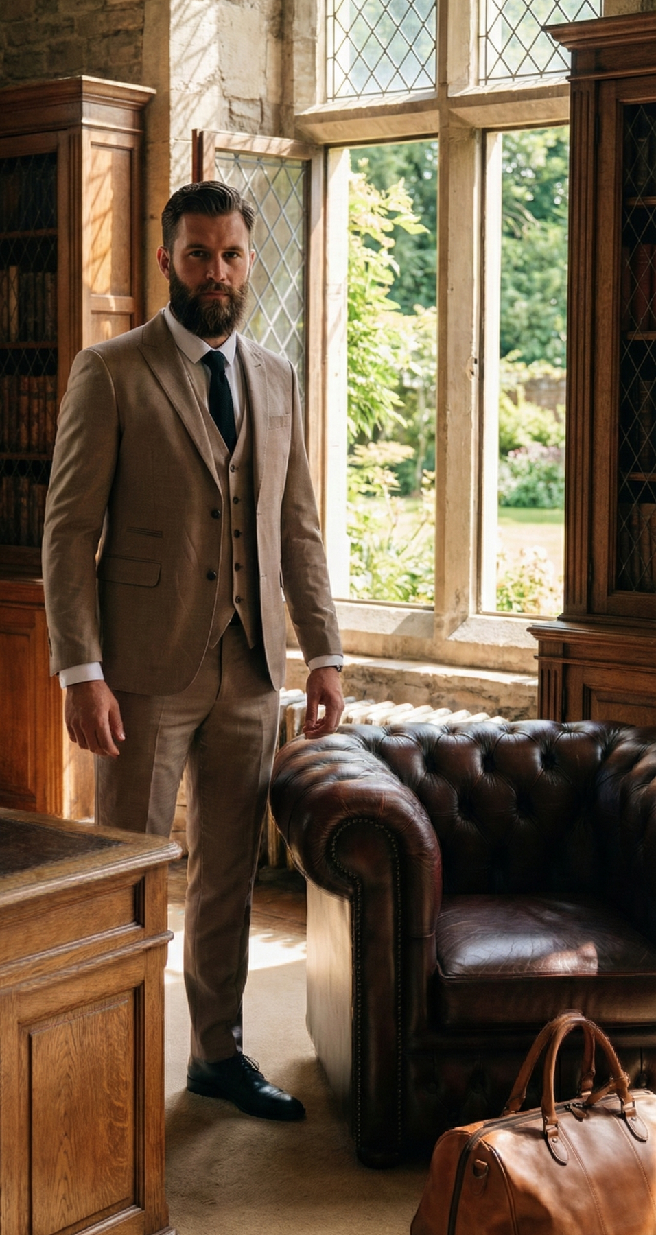 Wat je draagt, is geen gewoon pak. Dit is de Major van CASTLESON. Een driedelig meesterwerk dat niets hoeft te schreeuwen om indruk te maken. De gladde, beige stof vangt het daglicht op een manier die bijna onwerkelijk is. Zacht, geraffineerd, zelfverzekerd. Dit is het uniform van een man die weet wie hij is. En wat hij uitstraalt.
