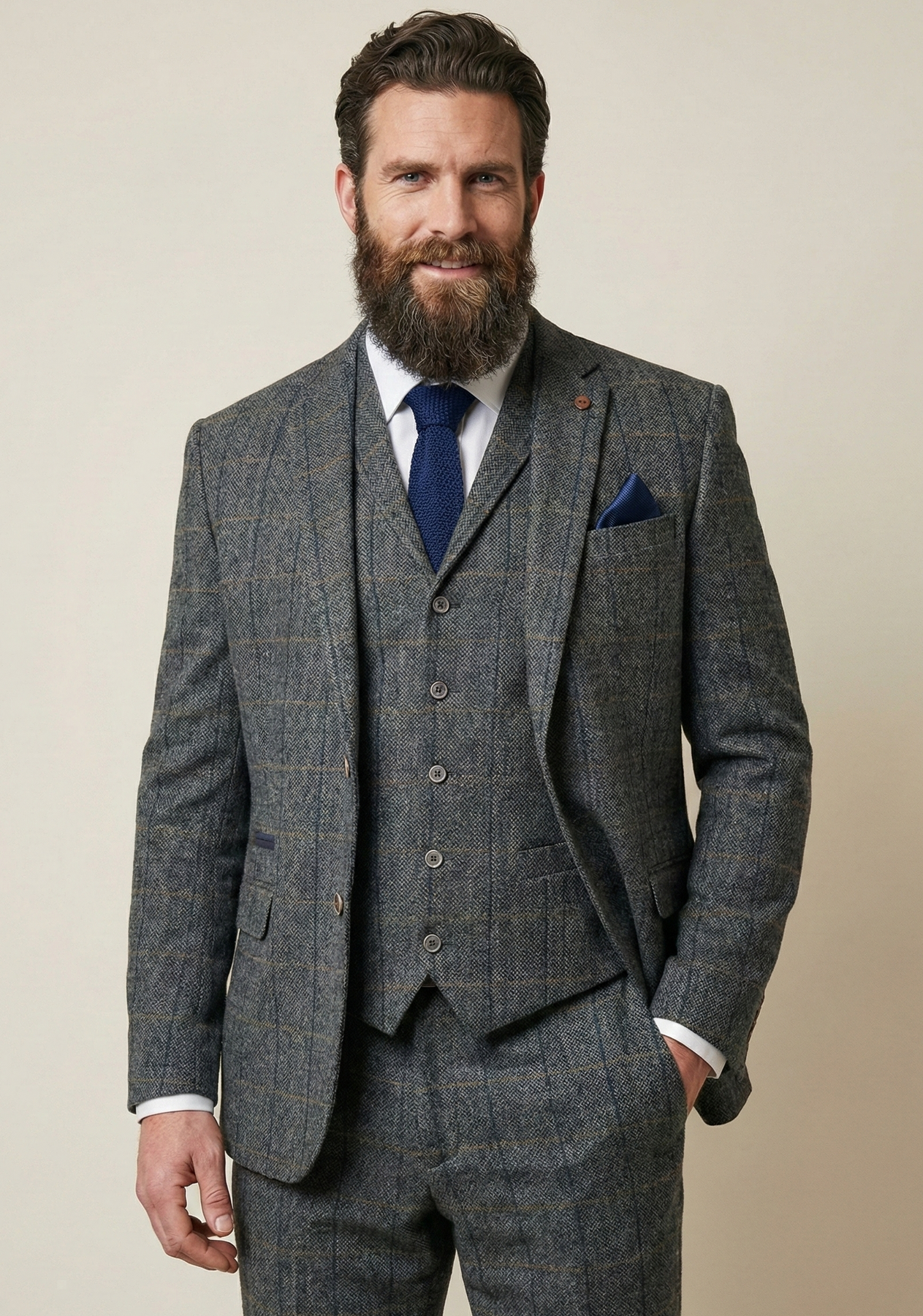 Er zijn pakken, en er zijn pakken die een verhaal vertellen. De herringbone-weving in dit ensemble is zo’n verhaal: een subtiel visgraatpatroon dat generaties overleeft. Het vangt licht op in grijs en navy, waardoor het pak nooit vlak oogt. In de vroege ochtendzon straalt het koel en fris, terwijl het onder avondverlichting juist warmte en diepte toont.
