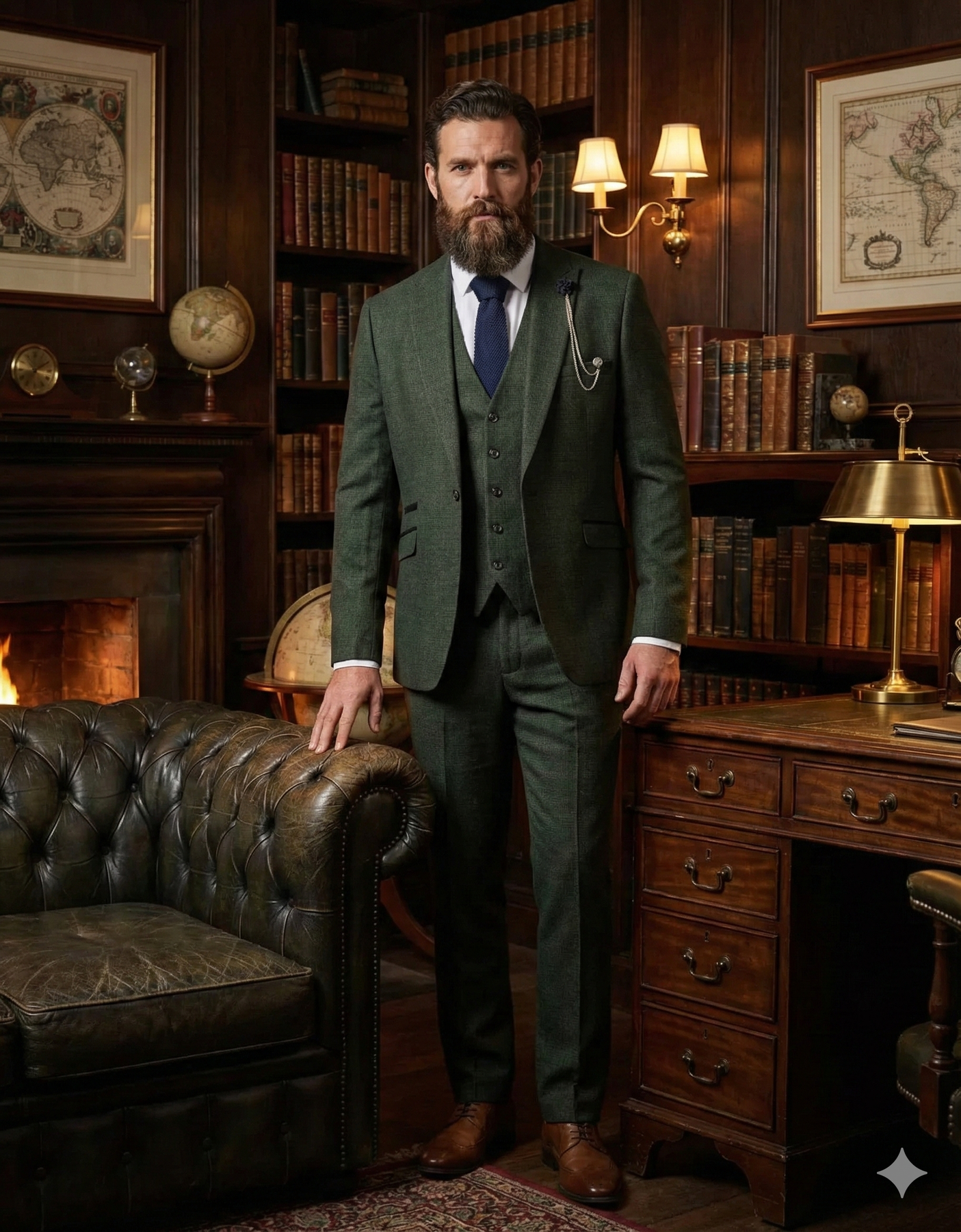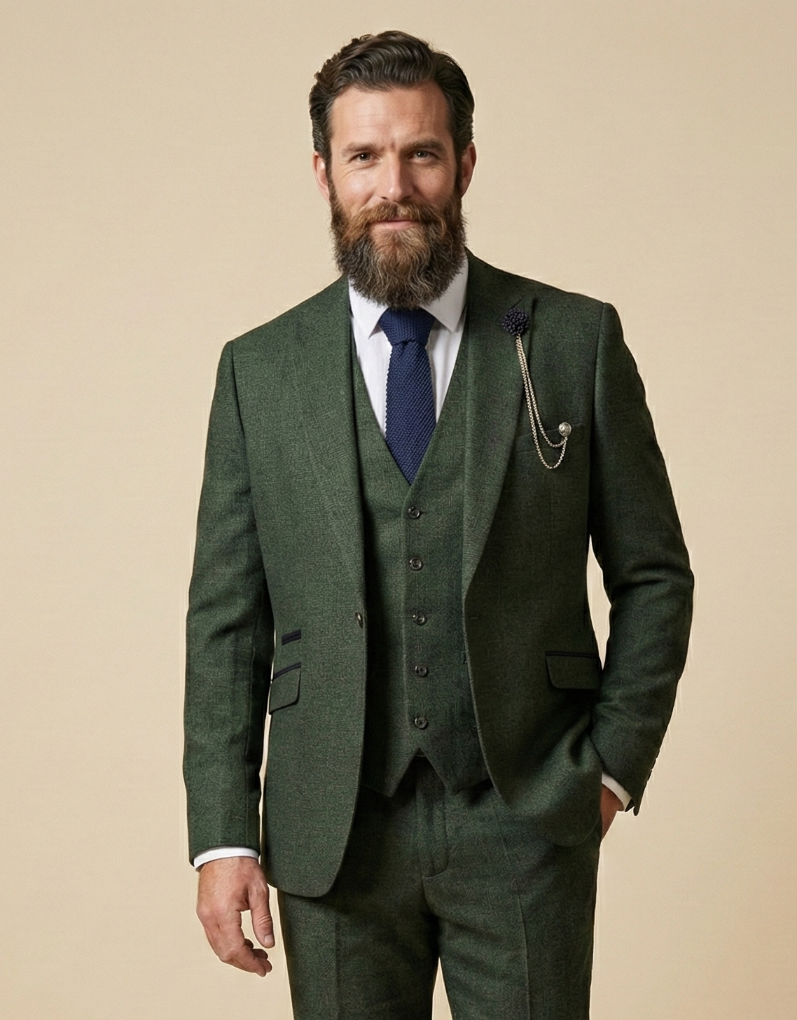 Stel je voor: je stapt een imposante marmeren hal binnen, waar het ochtendlicht in patronen op de vloer danst en elk geluid zachtjes wordt gedempt door dikke tapijten. Je jas wordt aangenomen, een discrete glimlach van de portier, en in één oogopslag is duidelijk: jij bent de man met stijl. Het Olive Green kostuum van Cavani Caridi valt meteen op. Niet schreeuwerig, maar met de kalme zelfverzekerdheid van iemand die zijn keuzes durft te maken. Dit is geen outfit — dit is een signatuur.